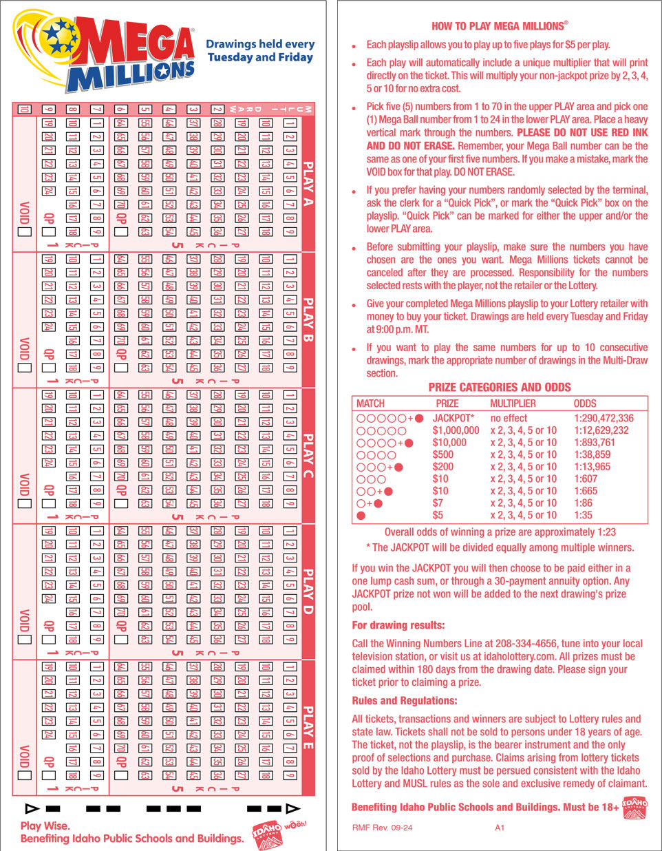 Each play costs $5 and will automatically include a unique multiplier that will print directly on the ticket. This will multiply your non-jackpot prize by 2, 3, 4, 5 or 10 for no extra cost. Pick five numbers between 1 and 70. Pick one Mega Ball number between 1 and 24. If you’d like random numbers, ask for a quick pick. Multi-draw tickets can be produced for up to 10 consecutive draws. Drawings are Tuesday and Friday at 9:00 pm MT.